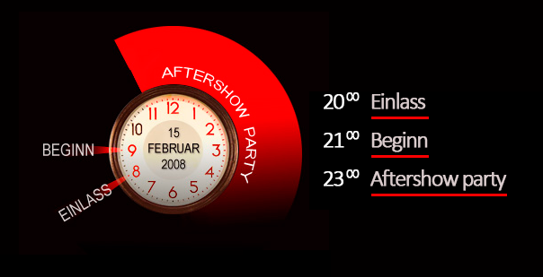 Element eines Plakates zur Ankündigung eines Tango-Events. Die Grafik veranschaulicht den Ablauf des Abends von 21 bis 4 Uhr. Die Figur ist freihandgezeichnet. Darunter eine ähnliche Grafik aus einem älteren Event.
