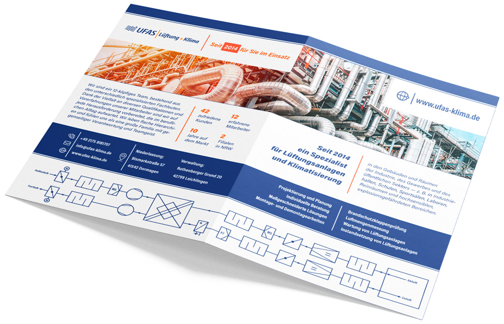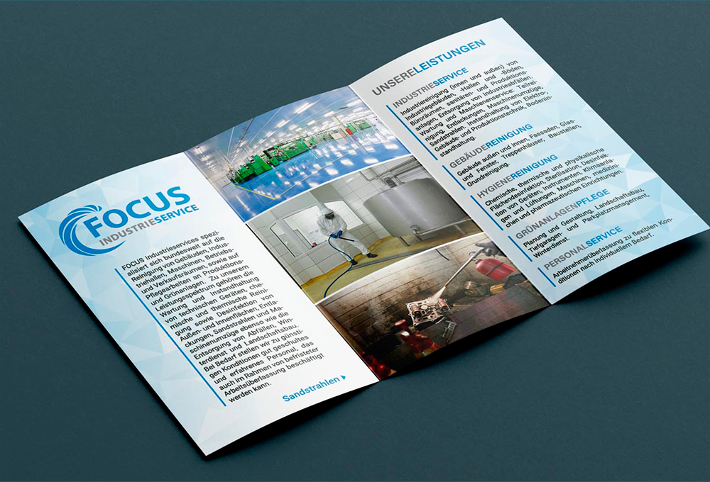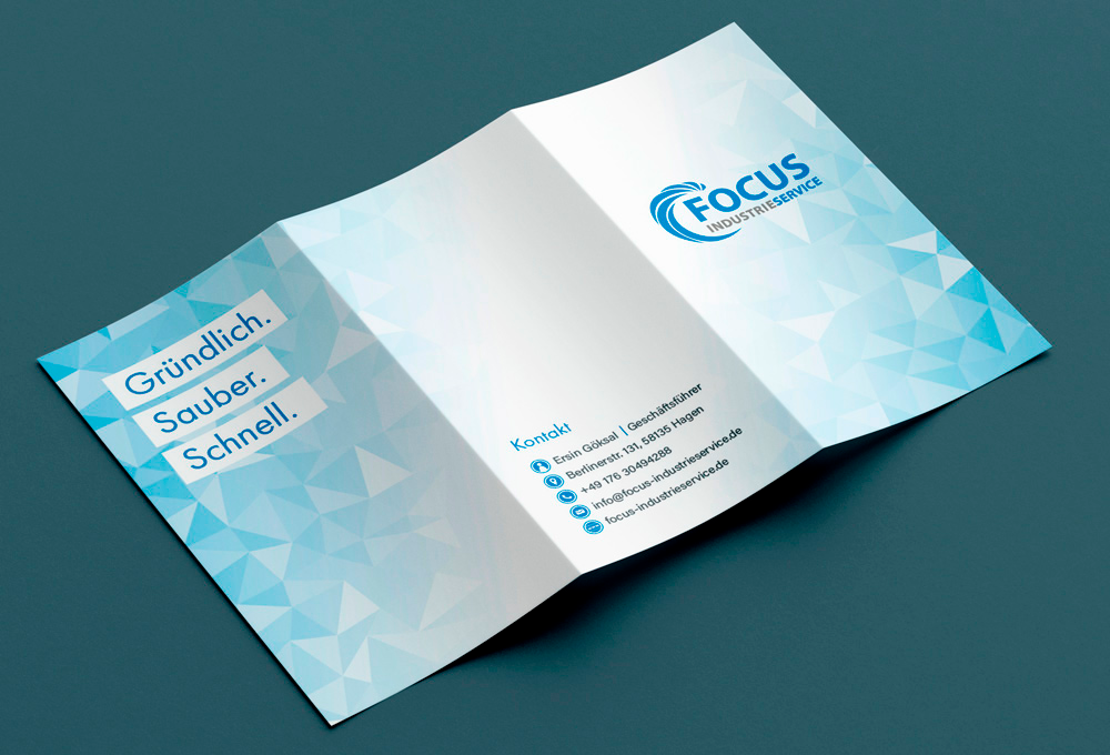 Flyer für eine Reinigungsfirma. Es wurden außerdem Webseite,  Visitenkarten, Logo sowie Autoaufkleber in Auftrag gegeben
