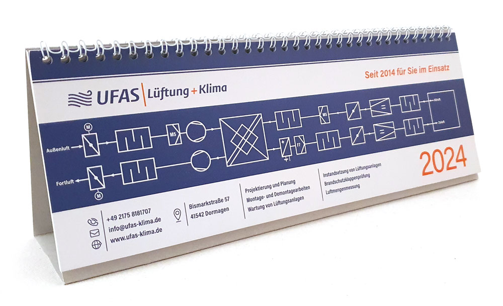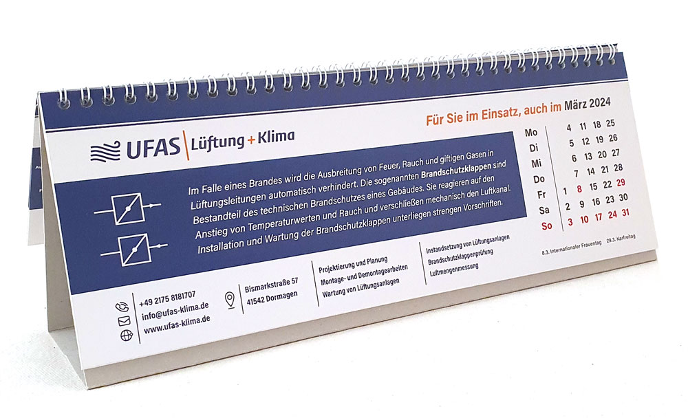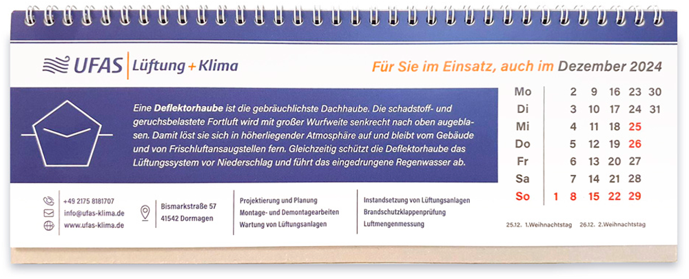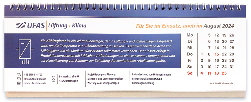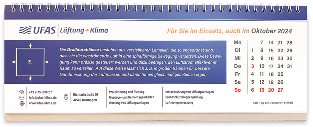 Jeden Monat wird ein Element der Lüftungsanlage vorgestellt. Kalender war als Werbegeschenk konzipiert